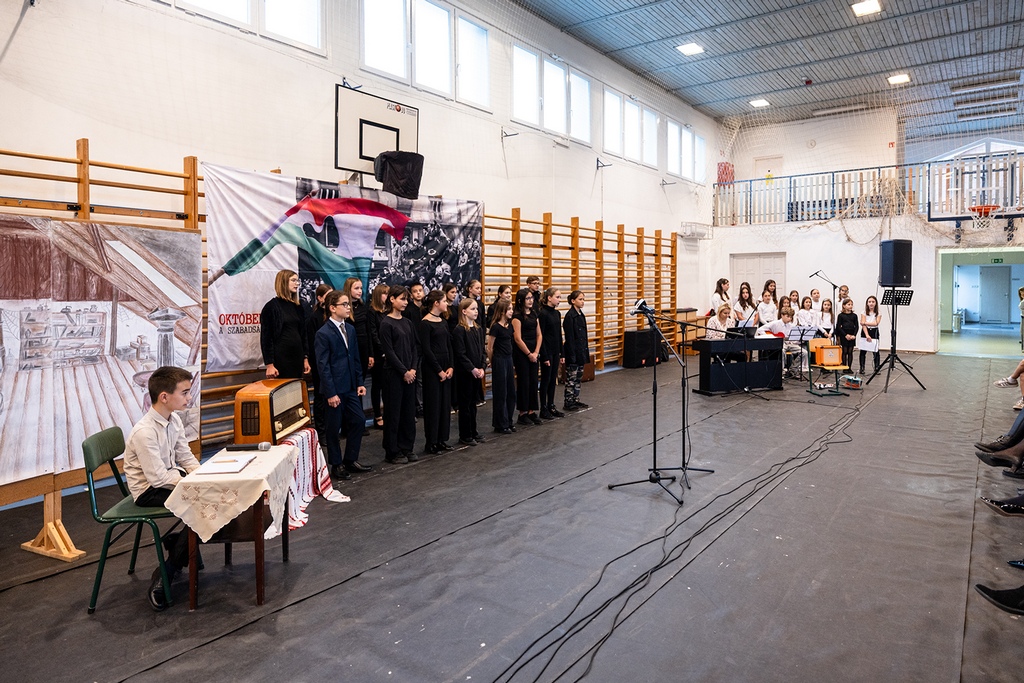- A mai napig is öröm, hogy a világtörténelem egyik legnagyszerűbb eseményének, az 1956-os forradalom győzelmének részese lehetett a nemzet – jelentette ki ünnepi beszédében az iskola tornatermében Csizmadia Zsuzsa, akinek szülei maguk is részt vettek a forradalmi eseményekben. A polgármester Németh Lászlót idézve hozzátette: "A nemzet gyötrésben, megaláztatásában úgy összeforrott, hogy diákok, munkások, katonák minden előzetes szervezkedés nélkül, közös elszántságukkal így megszerveződhettek, a vezér nélküli felkelőknek ez a csodálatos látványa meghaladta nem a reményemet, de a képzeletemet is."
